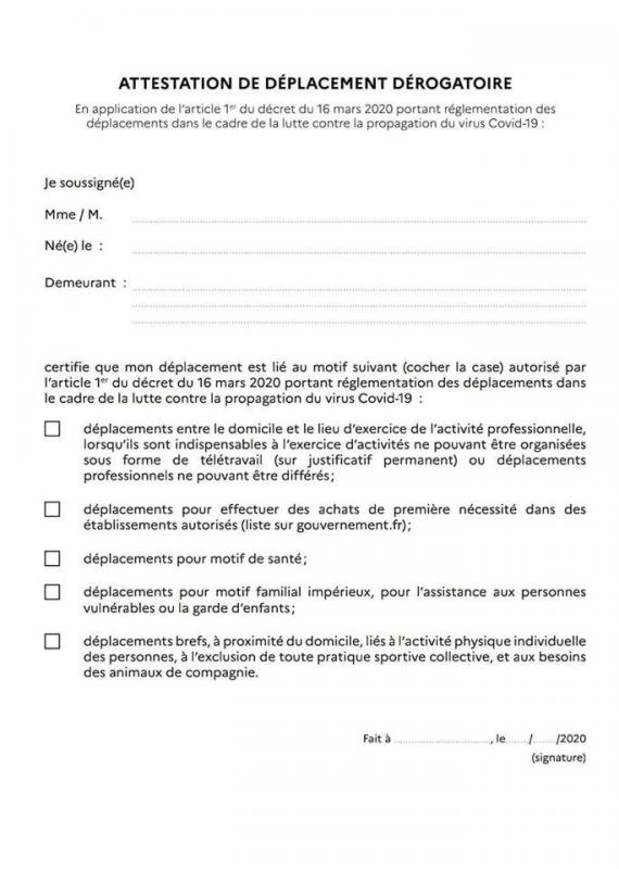 Modèle d'attestation de déplacement dérogatoire dans le cadre de lutte contre la propagation du Covid-19