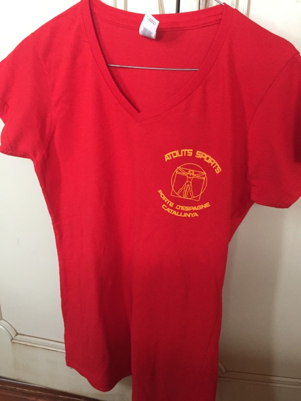 Notre tee-shirt est arrivé. Aux couleurs de notre pays catalan ( sang et or), il comporte un logo sur le coeur composé, du nom de notre association mais aussi de l' homme de Vitruve, d'après Léonard de Vinci, qui symbolise la perfection du corps humain avec des proportions parfaites, grâce, bien sûr, aux cours dispensés chez Atouts Sports P.E.C.A.